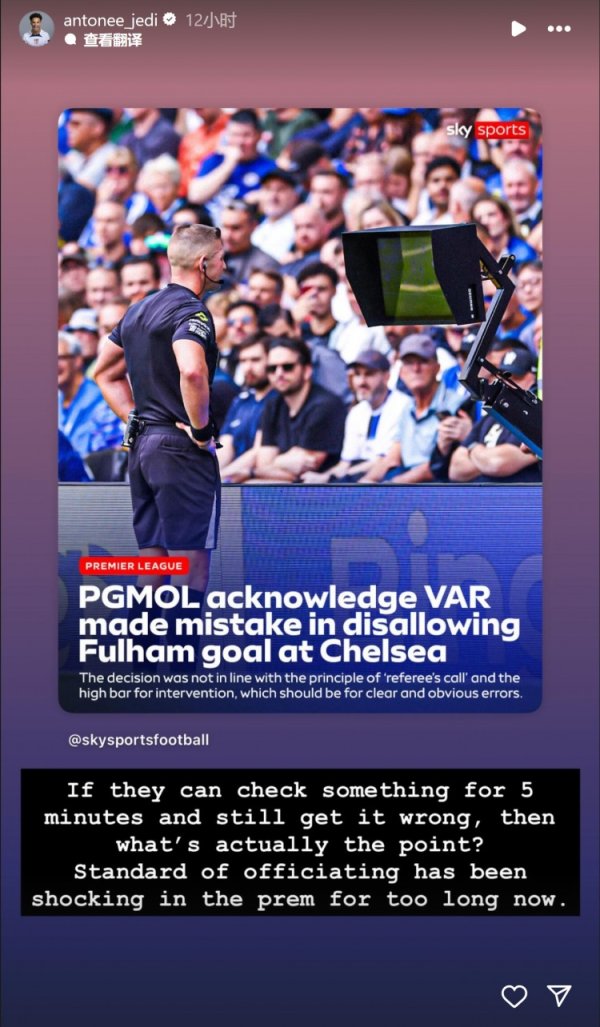 富勒姆球员罗宾逊:看5分钟回放还是判错了,英超裁判 水平很糟糕