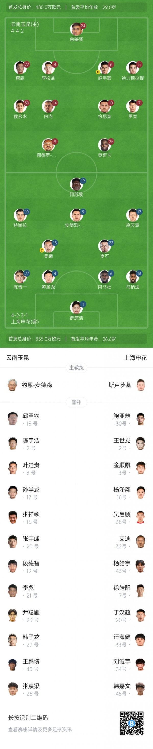 玉昆vs申花杆位:4外援PK5外援!侯永永先发,吴曦、特谢拉出战