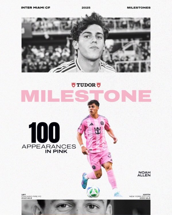 里程碑!迈阿密社媒祝贺:21岁后场球员艾伦迎来第100次出场 💗👏