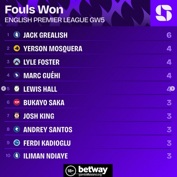 9月24日讯 英超第5轮战罢,squawkafootball列各项数据排行,苏超直播格拉利什是本轮造对手违例 次数最多的球员,共有6次。