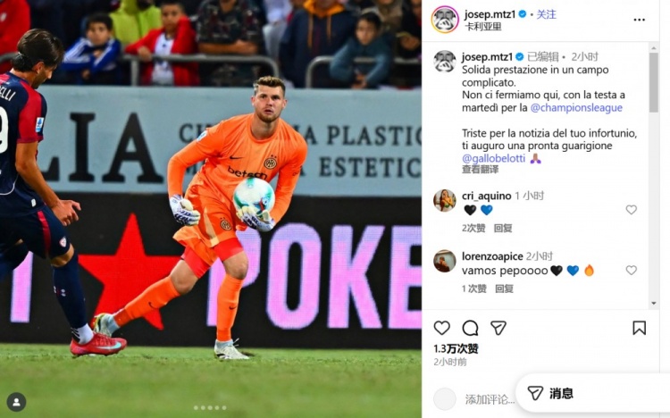 9月28日讯 本轮意甲赛事 ,国米在客场应战 以2-0的比分战胜卡利亚里。本场赛事 ,蓝黑军团守门员何塞普-马丁内斯杆位登场。