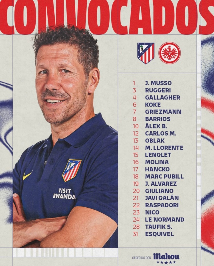 马竞公布对阵法兰克福名单:阿尔瓦雷斯领衔,索尔洛特因伤缺席