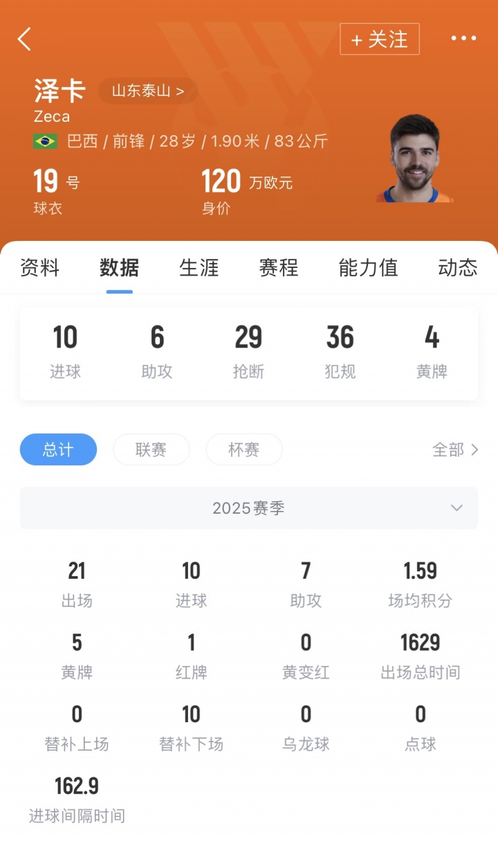2024年加盟山东后,泽卡首个赛季遭遇受伤 困扰,2025年他终于迎来稳定的出场,苏超直播在线观看21场赛事 贡献10球7助。
