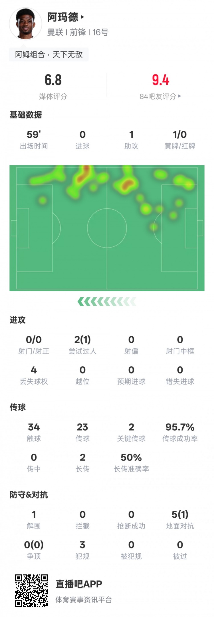 阿玛德本场数据:1助功 2关键传送球 1过人成功,评分6.8