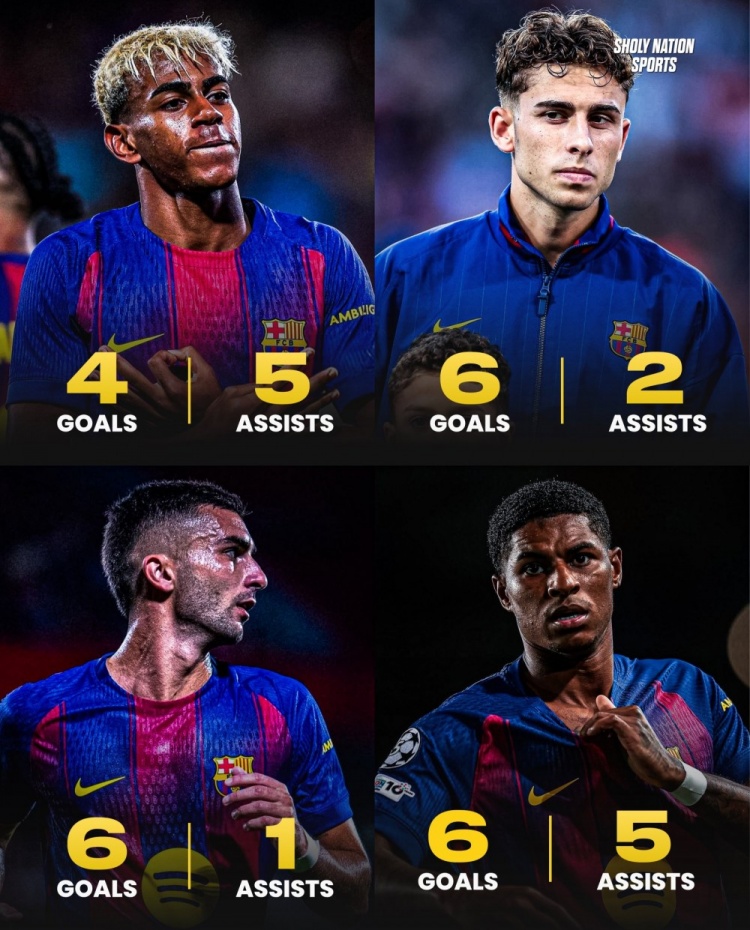 巴萨攻击 端球员本赛季数据:拉什福德6球5助、亚马尔4球5助